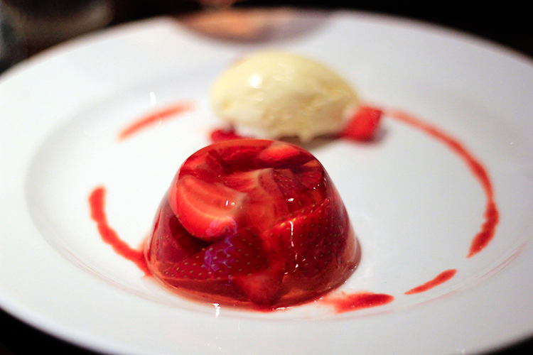 Ainsi qu’un petit dessert, de la gelée de champagne avec des morceaux de fraises accompagnée de glace à vanille et de fraises fraîches, un vrai délice !!