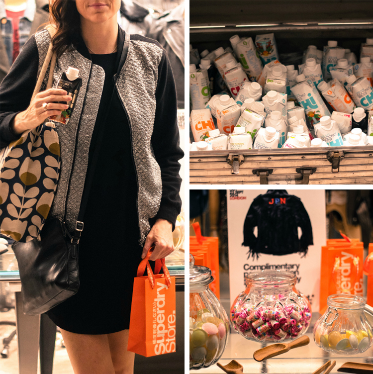 Et nous voilà chez Superdry, où c’est l’ ambiance de folie, bonbons, dégustation d’eau de coco aux différents parfums…