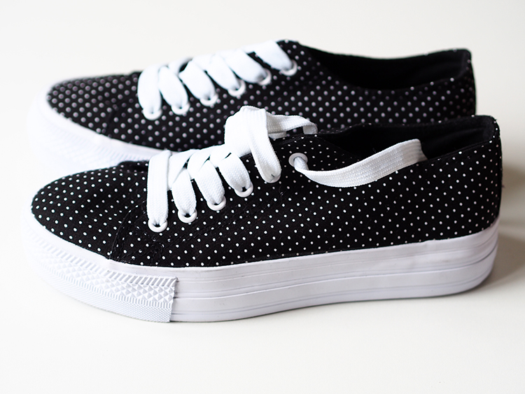 Des Baskets à pois légèrement compensées chez Etam à mini prix et une Jupe imprimée chez Zara à moins de 10€