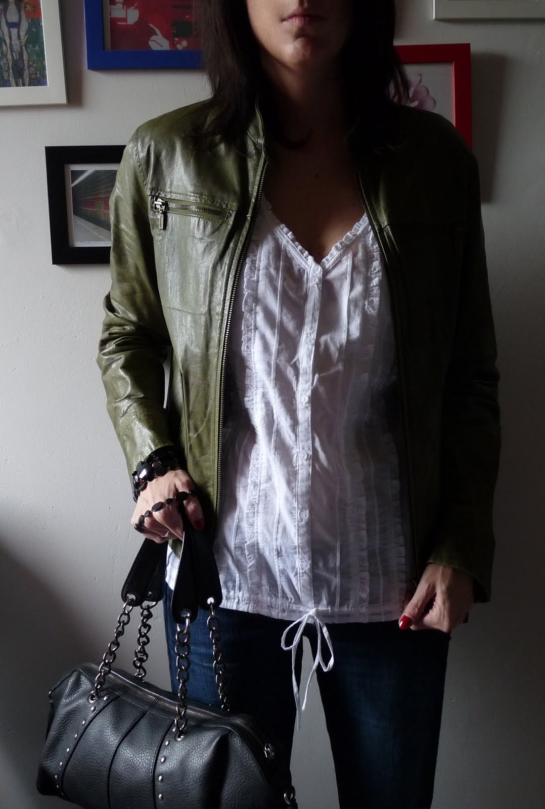 Une petite veste en cuir ZARA que j’avais trouvé l’année dernière sur Ebay.uk pour une vingtaine d’euros, j’avais craqué pour sa couleur qui change un peu des coloris habituelles… une petite Blouse blanche, un Jean et une paire de Ballerines et me voilà prête pour arpenter les rues en attendant que le soleil revienne…