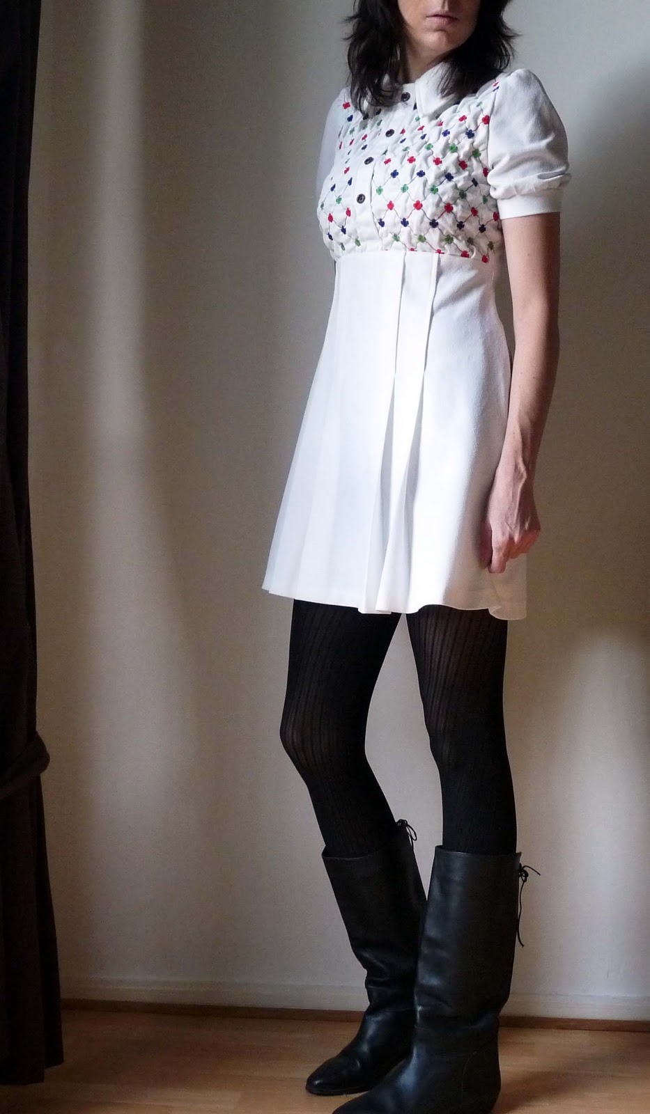 Mais bon voilà, il y a quelques temps j’ai acheté cette Robe Vintage dans une brocante et je n’avais pas encore eu le temps de la porter car un peu trop courte pour la porter jambes nues…. alors j’ai tenté, avec des collants noires et finalement, je trouve que ça passe plutôt pas mal, qu’en pensez vous ?