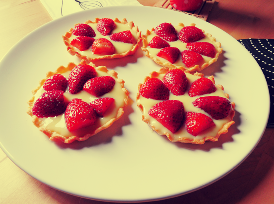 – Une fois la crème pâtissière refroidie, en garnir le fond des moules à tartelettes et recouvrir des fraises coupées, voilà c’est prêt !
