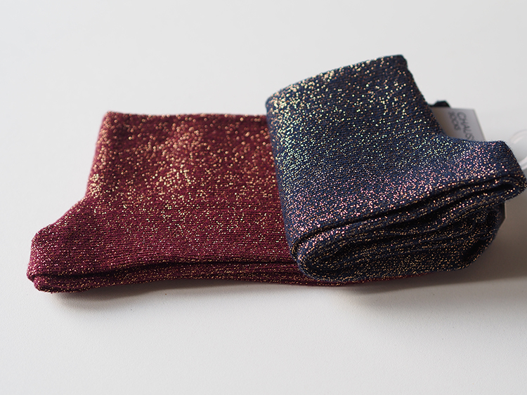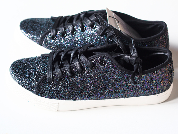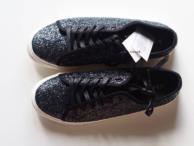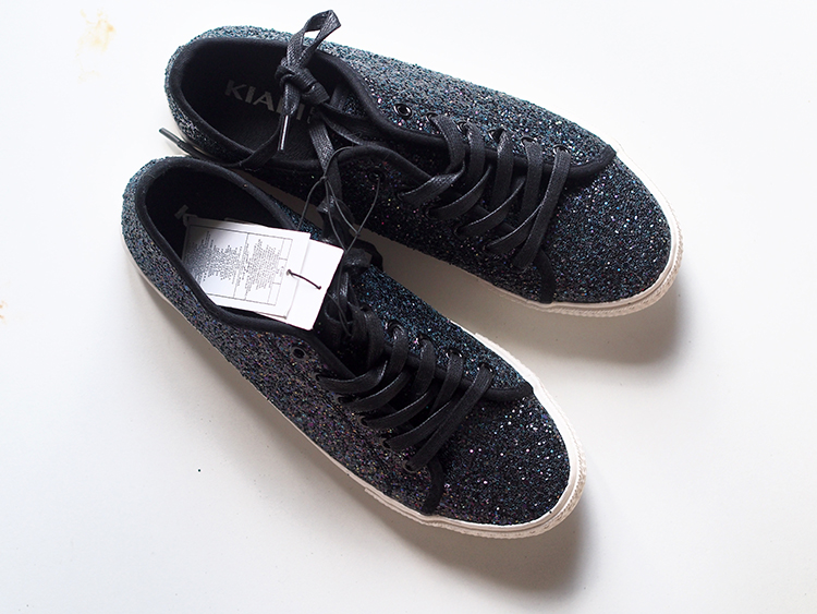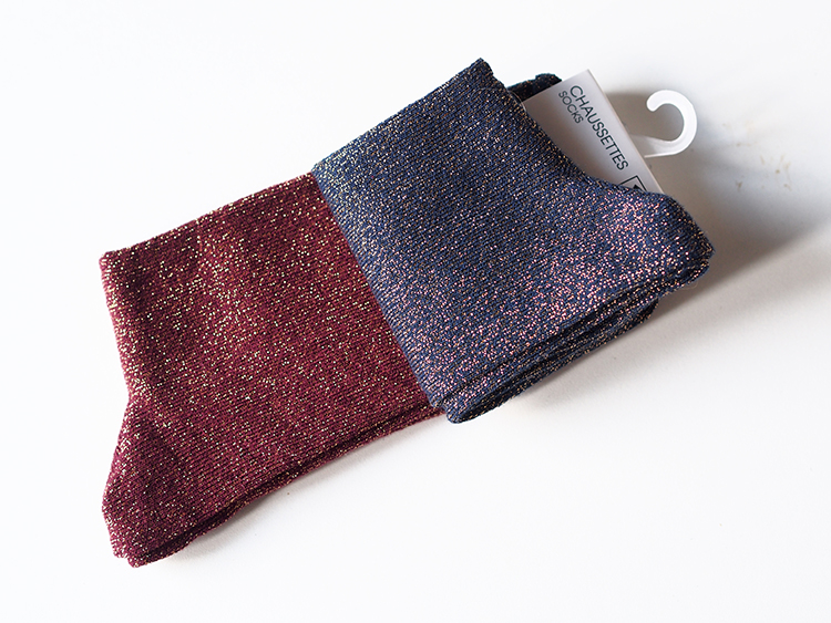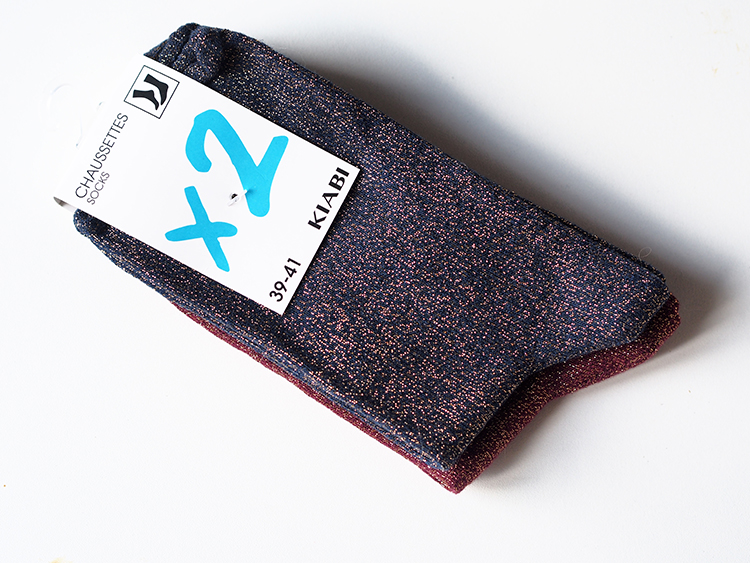 Je ne suis donc pas repartie les mains vides, mais avec une paire de Baskets pailletées, un Slim gris très bien coupé et des petites Chaussettes en lurex !